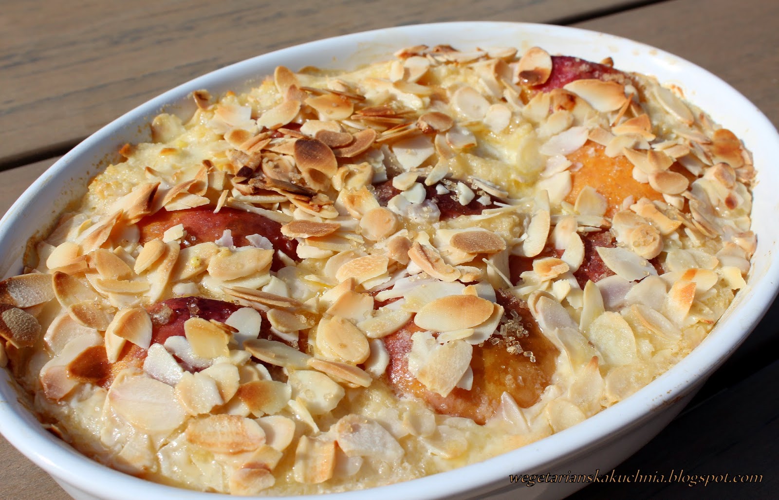 Kaszę przygotować zgodnie z przepisem na opakowaniu. Wymieszać z serkiem homogenizowanym. Brzoskwinie podzielić na ćwiartki. Kaszę umieścić w naczyniu żaroodpornym. „Wcisnąć” w kaszę delikatnie ćwiartki brzoskwiń, polać śmietanką, posypać cukrem i migdałami w płatkach. Nagrzać piekarnik i zapiekać deser ok. 25 minut (ostatnie 15 minut zapiekać od góry). Podawać z listkami świeżej mięty.